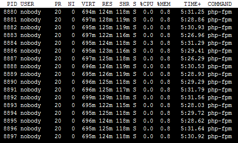 如上所示 top 命令的结果中和内存相关的列分别是 VIRT,RES,SHR。其中 VIRT 表示的是内存占用的理论值,通常不用在意它,RES 表示的是内存占用的实际值,虽然 RES 看上去很大,但是包含着共享内存,也就是 SHR 显示的值,所以单个 PHP 进程实际独立占用的内存大小等于「RES – SHR」,一般就是 10M 上下。以此推算,理论上 1G 内存能支撑大概一百个 PHP 进程,10G 内存能大概支撑一千个 PHP 进程。当然并不能粗暴认为越多越好,最好结合 PHP 的 status 接口,通过监控活跃连接数的数量来调整。