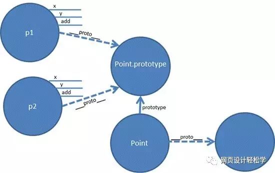 在上面的代码中,我们使用了 new 操作符和 Point 函数来构造点对象,这个对象带有 x 属性和 y 属性和一个 add 方法。你可以将最后的结果想象成图 6 的样子。