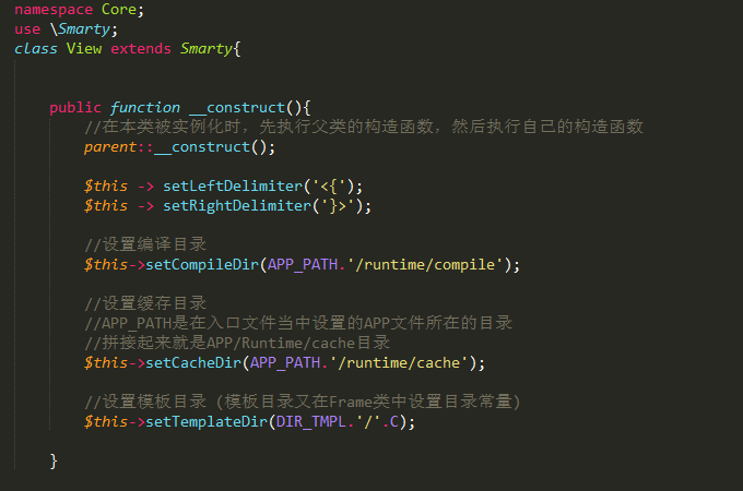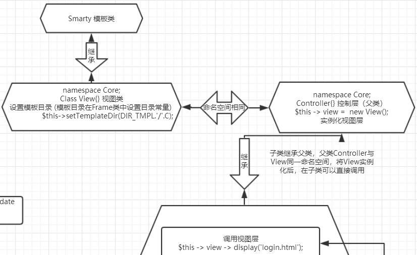 子类控制器继承父类控制器,父类控制器与VIew视图层同命名空间,可直接实例化视图层,而视图层继承Smarty模板,因为,在子类控制器中可直接使用视图层的对象调用Smarty中的方法。