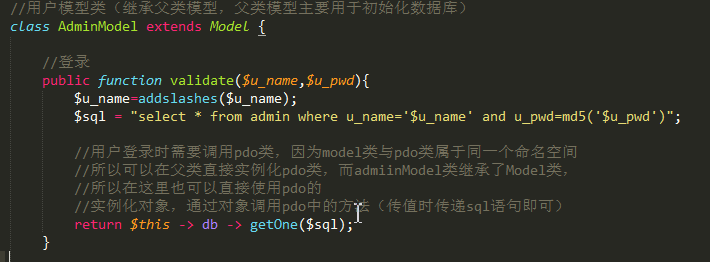 PHP脚本执行至模型层,调用相应的方法,在这里,需要定义SQL语句,通过操作数据库的方法对数据库进行操作。