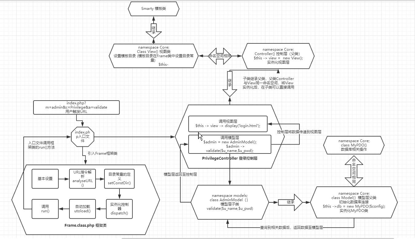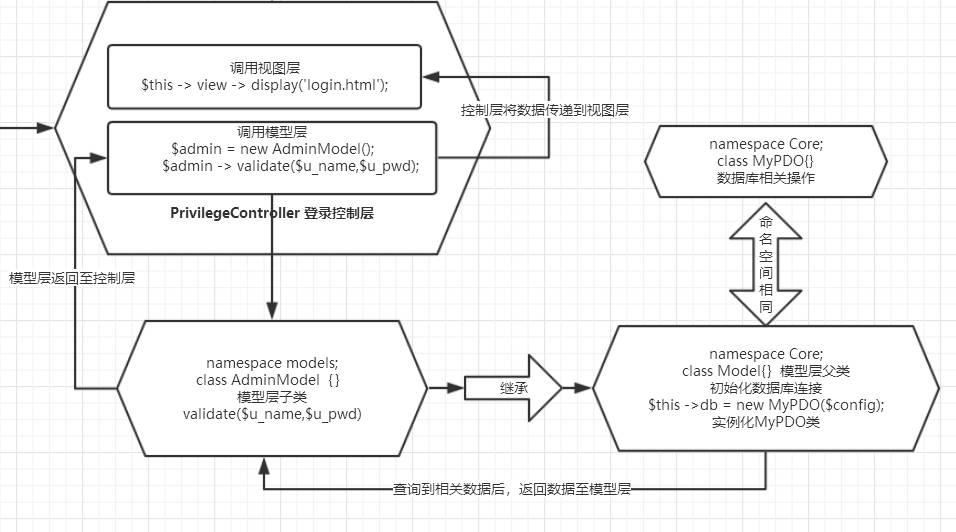 最后,模型层通过PDO类对数据操作完毕,PDO返回结果至模型层,模型层继续返回至控制层,控制层将数据传递至视图层,然后调用视图层,进行一次周期的循环
