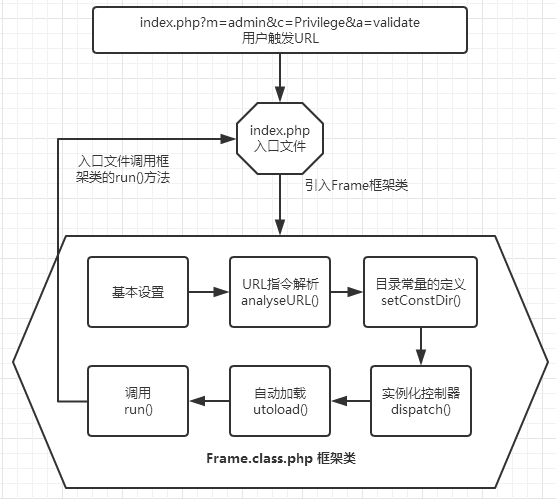 当一个从用户页面的URL被点击时,相应的指令被传递到入口文件,入口文件引入Frame类并调用的相应的方法(如run()),PHP脚本按照代码开始执行,解析URL指令、然后根据解析的结果定义相关的目录常量,然后根据不同的功能,实例化不同的控制器,当系统找不到需要的类时,自动加载功能启用,通过自动加载,找到相应的类并完成实例化,然后调用控制器中相应的方法,至此,Frame框架的任务完成,流程转入到控制器当中。