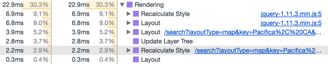 其中js的处理用掉了46.8ms(js里面还要更新dom),排第二的rendering花掉了22.9ms,这个rendering包括上面说的css计算和layout: