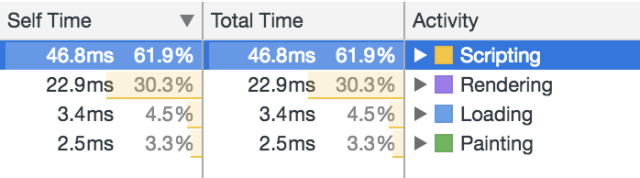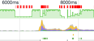栏帧率,顶点表示60fps,红色方格表示渲染时间比较长的帧,Chrome把这种情况叫做jank。可以看到上面有3个比较大的低谷,这并不是异常的失帧,这是Chrome检测到页面没有动了,idle空闲了,自动降低帧率。第二栏是CPU,黄色的为script,紫色的是CSS,蓝色是html,可以看到往往script占了比较高的CPU。关于timeline更详细的说明,可以查看chrome的文档。