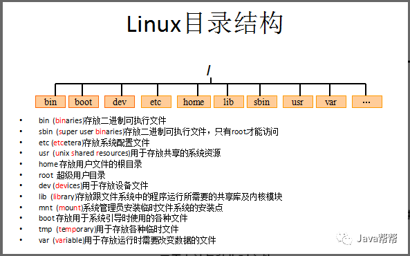 /lib: (library) /usr/lib: /usr/local/lib:系统使用的函数库的目录,程序在执行过程中,需要调用一些额外的参数时需要函数库的协助,比较重要的目录为/lib/modules。