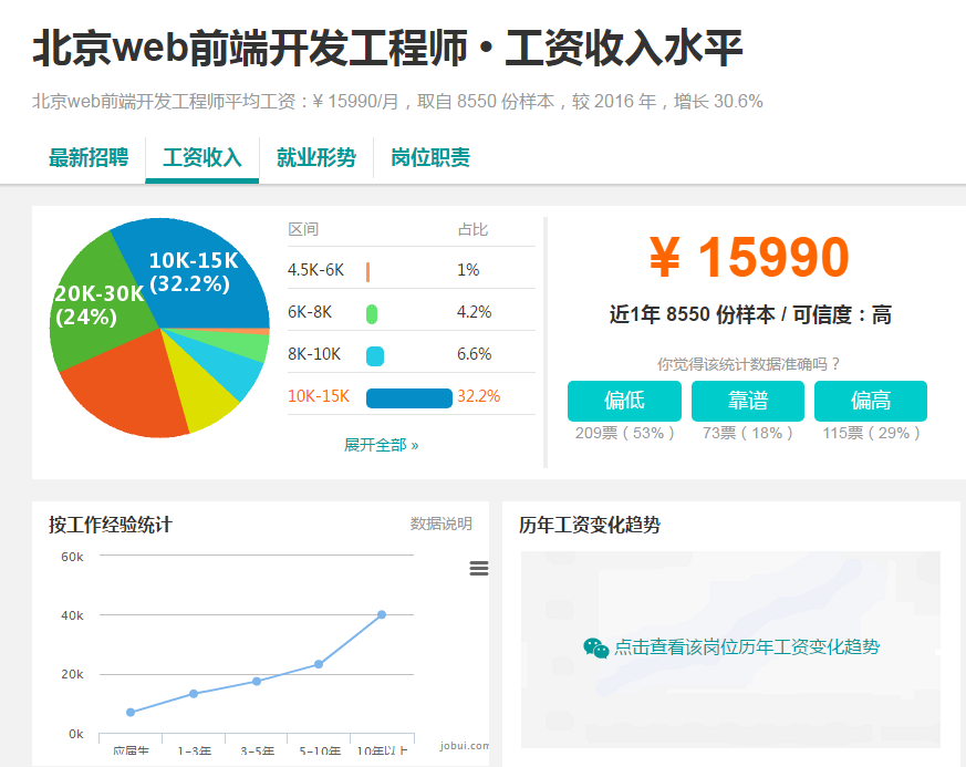 虽然近两年人工智能、大数据工程师大火,但Web前端开发依然是老牌热门岗位.从就业趋势来看,Web前端工程师的薪资仍然呈上升趋势.北京、上海、广州、深圳等地HTML5前端工程师的薪资待遇更是一再飙升.