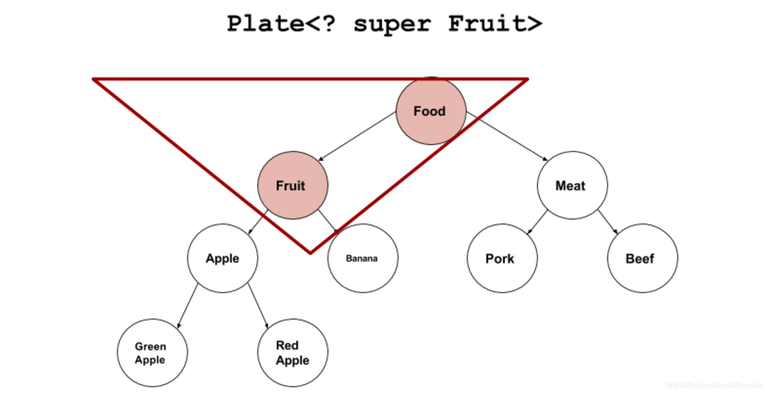 表达的就是相反的概念:一个能放水果以及一切是水果基类的盘子。Plate<? super Fruit>是Plate的基类,但不是Plate的基类。对应刚才那个例子,Plate<? super Fruit>覆盖下图中红色的区域。