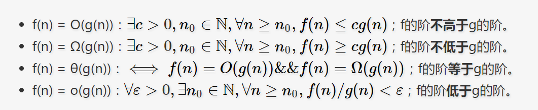 总之,分析算法复杂度的时候,并不用严格演算出一个具体的公式,而是只需要分析当问题规模充分大的时候,复杂度在渐进意义下的阶。记号O、Ω、θ和o可以帮助我们了解函数渐进阶的大小。