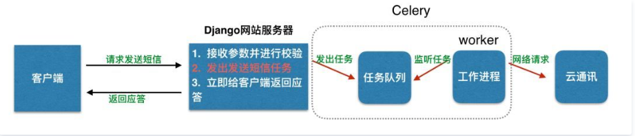 在项目中一共有三个地方用到了celery异步任务。分别是发送短信验证码、发送验证邮件以及生成详情页面。下面拿发送短信验证码的例子来简单的说一下celery。