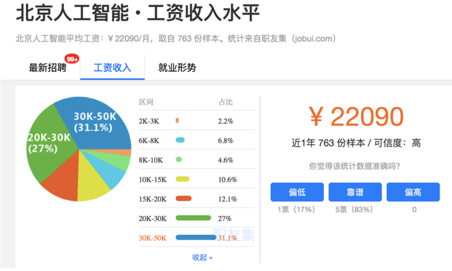 在职友招聘网上可以查到人工智能的薪资数据如下,你可以参考。