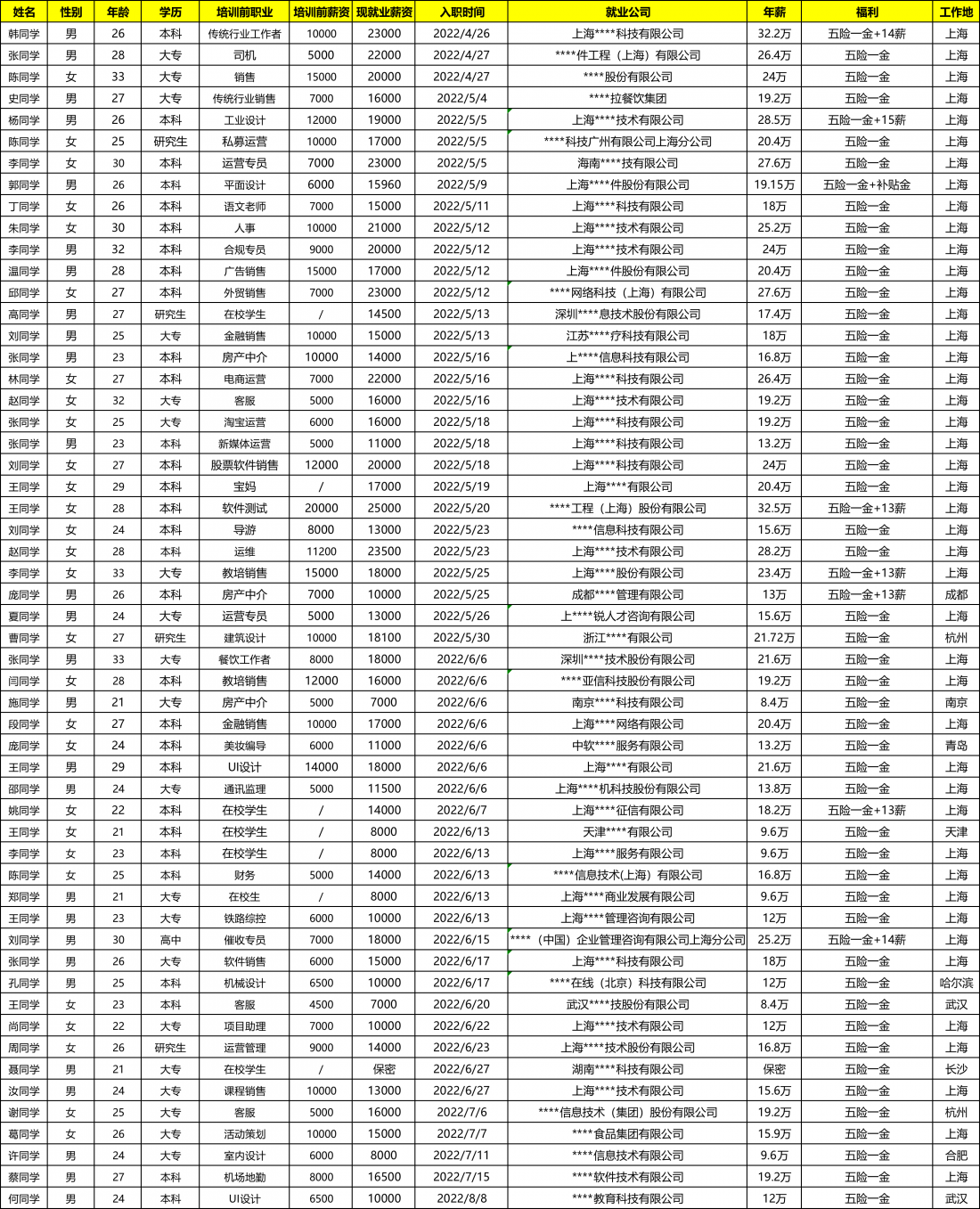 P.S. 为了避免就业信息给已就业学员带来不必要的麻烦,公布的就业信息会有部分信息暂时隐藏。