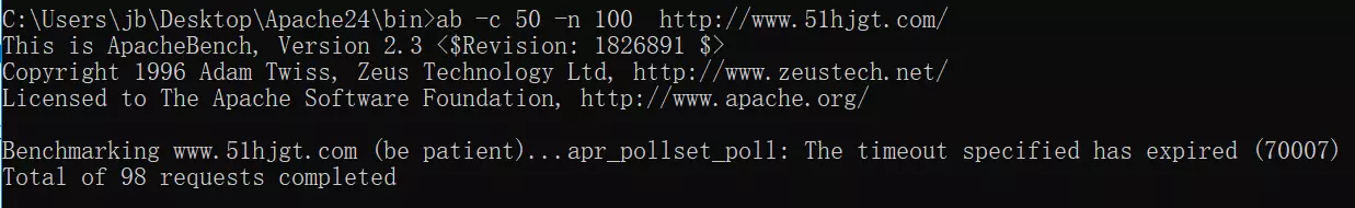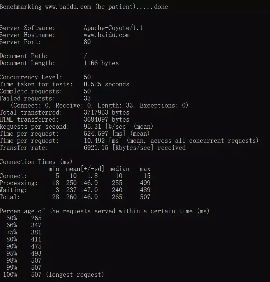 当然,有同学觉得每次都进来这个目录很麻烦,那可以把Apache24\bin这个路径配置到环境变量,后续就可以直接ab使用了,具体Windows下环境变量怎么配置,网上搜索下,很多的~ 直接压测网站命令: ab -c 50 -n 50 [color=rgb(0, 105, 214) !important]http://www.baidu.com/