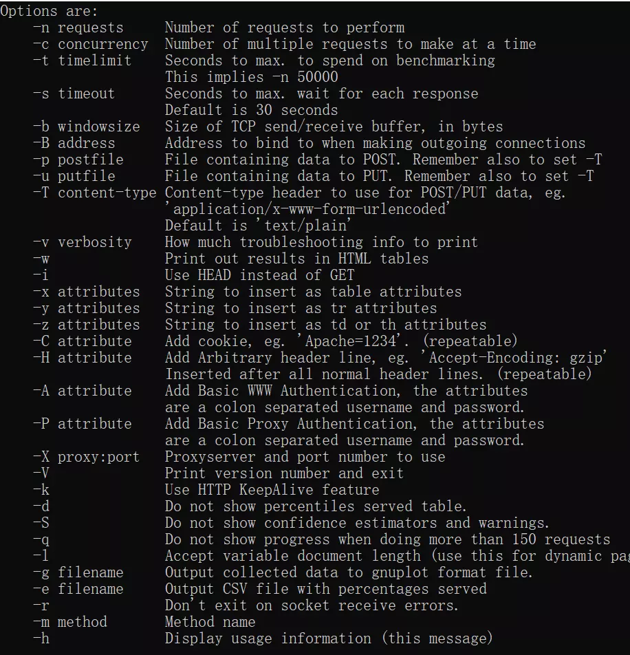 这一陀看不懂?没关系,下面教你怎么看 ab命令参数说明第一次使用ab命令时,不知道有什么参数,可以输入ab -help,然后就会弹出这么一坨东西: