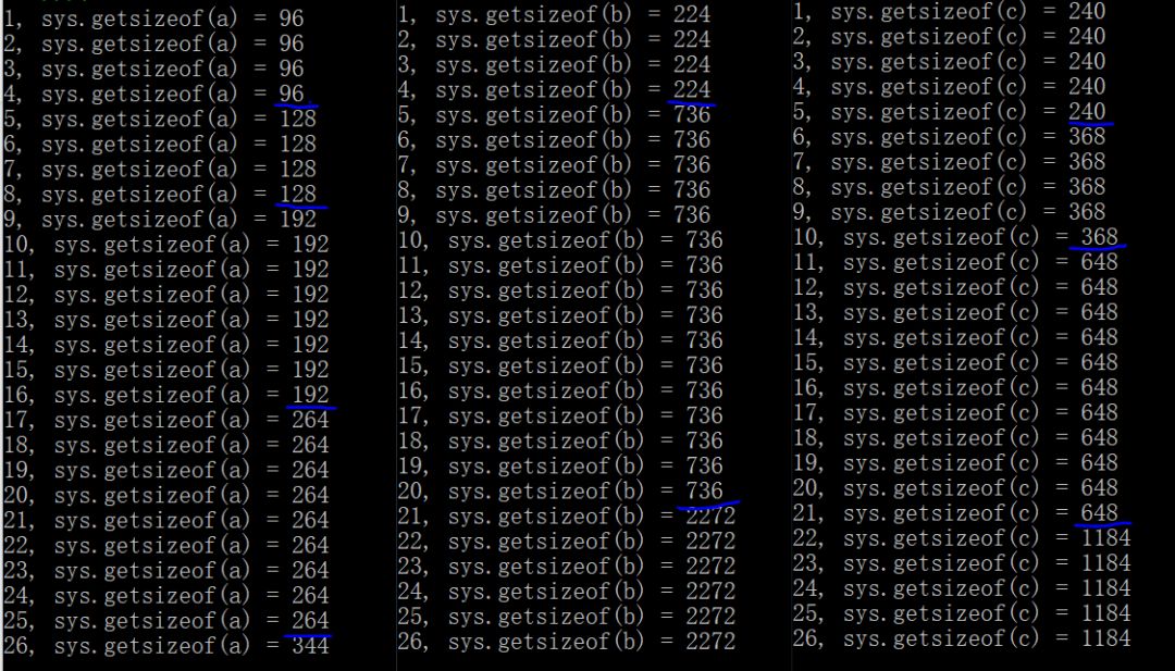 分别给三类可变对象添加 26 个元素,看看结果如何: