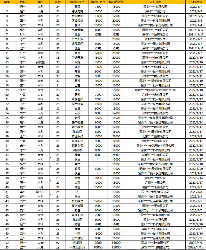 2、我们敢于以班级为单位公布每一位学生的就业信息,包括班级就业人数、就业率、就业速度、个人就业薪资、平均就业薪资等数据,敢于公布所有就业数据的才是“真就业”薪资!