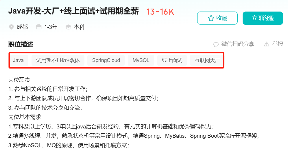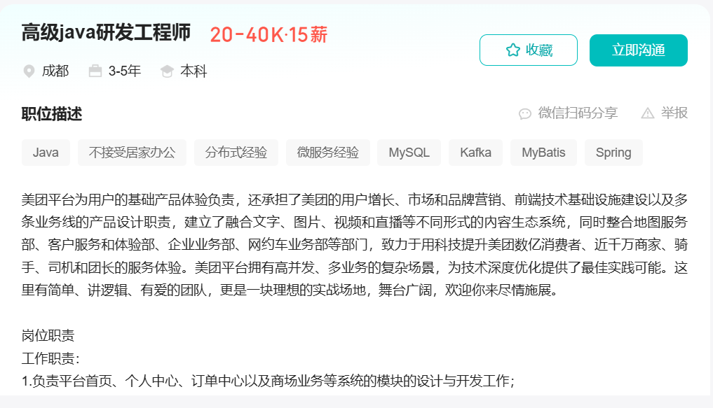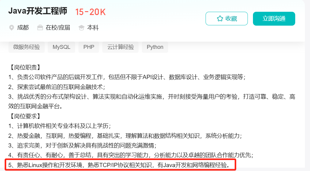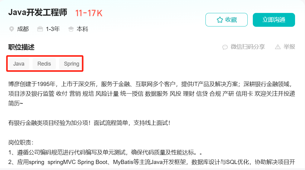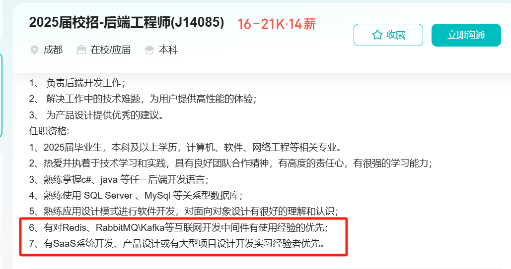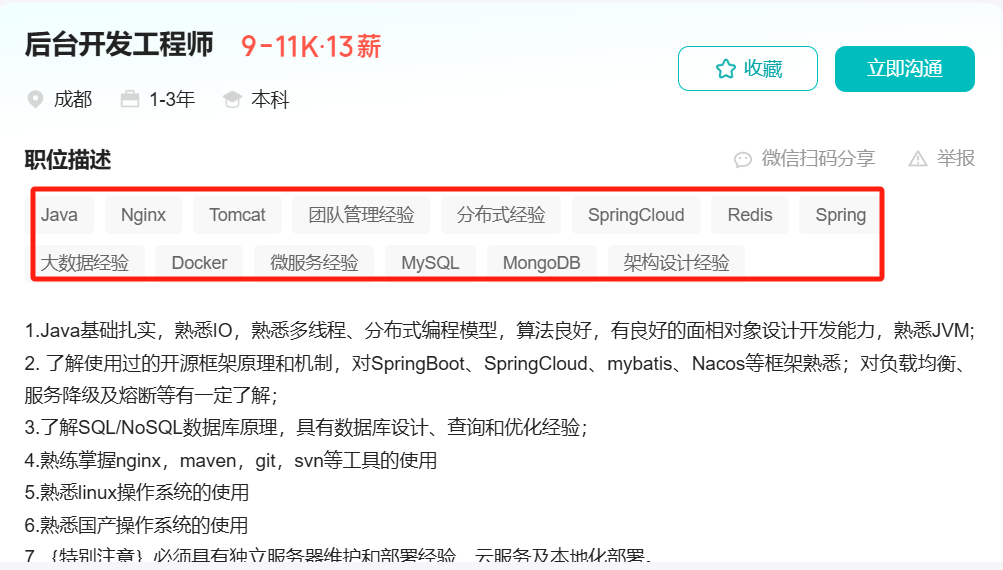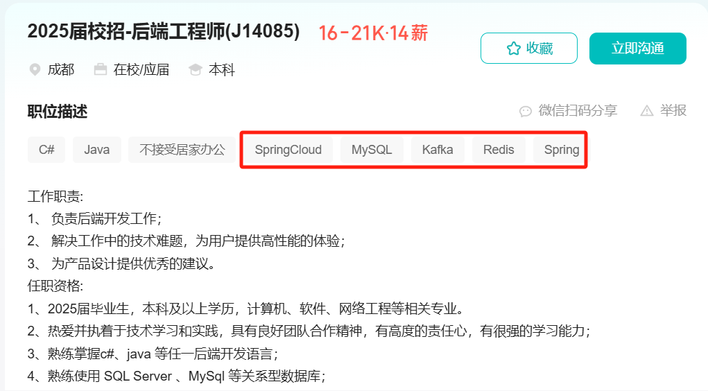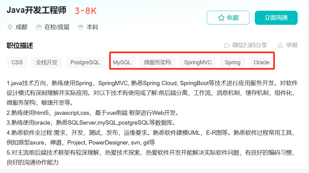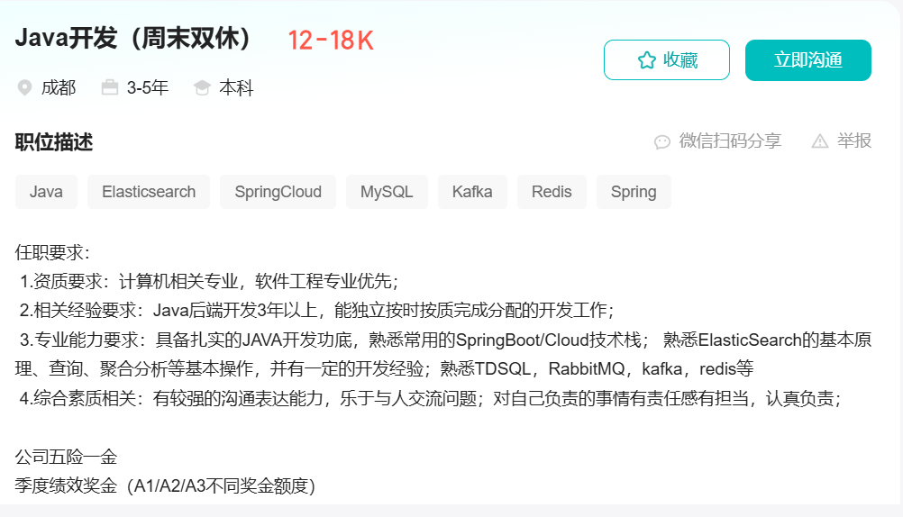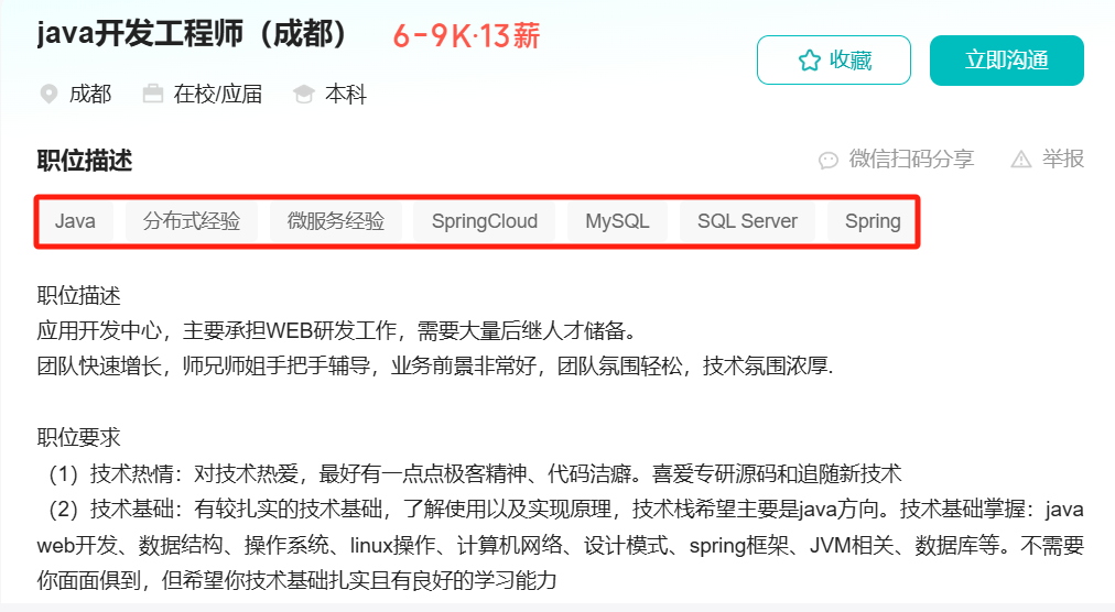 上面是我按照工作经验依次为“应届毕业生”、“1-3年工作经验”,“3-5年工作经验”截取的9个招聘需求。不难发现,不管应聘者是应届毕业生还是3-5年的开发者,企业都要求会SpringBoot、MyBatis、Redis、SpringCloud微服务、ElasticSearch等技术,尤其是微服务技术已经是入职的基本门槛了,但是很多应届生对该方面的知识很缺乏。此外大学学习的的编程语言也很杂,各个编程语言(C/C++、Java、Android、Python、前端、php)都会学一点,属于样样学,样样松的情况,如今企业的分工是非常明细的,不可能让一个Java程序员去做C语言开发,也不可能让C程序员去做前端开发,企业更愿意招聘在某一领域精通的开发者。