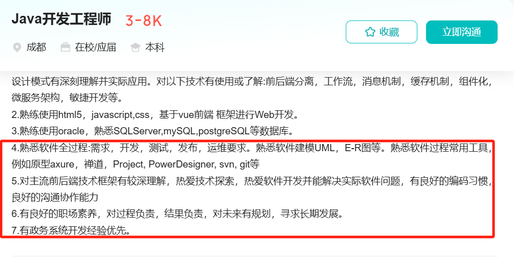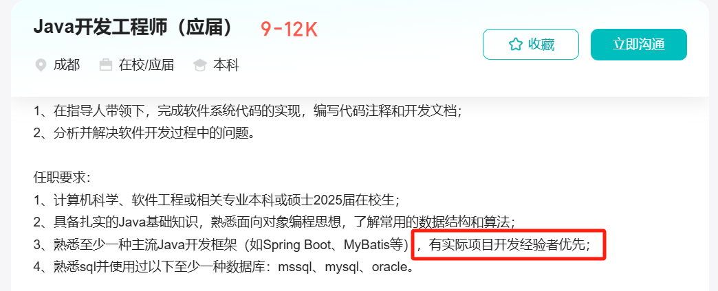 1. 所学知识和招聘需求不匹配 对于计科专业,可以通过在boss直聘上搜对应的岗位来检验所学知识能否达到企业的要求。Java作为很多大学的主修课程,我们一起来看一下企业对Java开发人员的要求吧。 图1 招聘应届生Java开发需求1 图2 招聘应届生Java开发需求2 图3 招聘应届生Java开发需求3