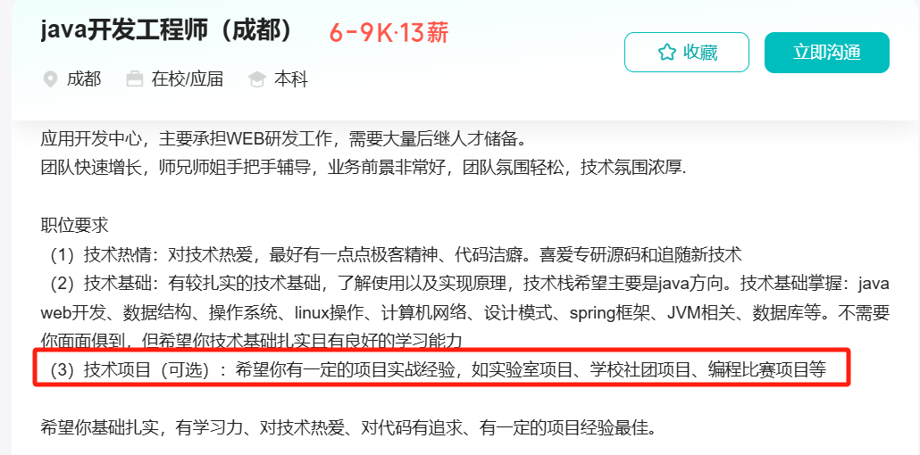 2. 项目经验欠缺 很多计科的学生,一直到毕业都没接触过真正的企业级项目,即便是参加过几次实训或实习,但也受制于课时及其他方面的原因,所学项目在技术深度和业务复杂度上都远远达不到企业级的标准。 越是大环境不好企业就越珍惜新人的培养成本和试错成本,因此企业更希望招聘能直接上手做项目的人。对于双非的学生,校招更是稀缺资源,因此更需重视项目经验的积累。 下面5个截图是针对应届生的招聘需求,不难发现对于应届生企业也更愿意要有实际项目开发经验的。 图10 应届生招聘需求 图11应届生招聘需求 图12 应届生招聘需求 图13 应届生招聘需求 图14 应届生招聘需求