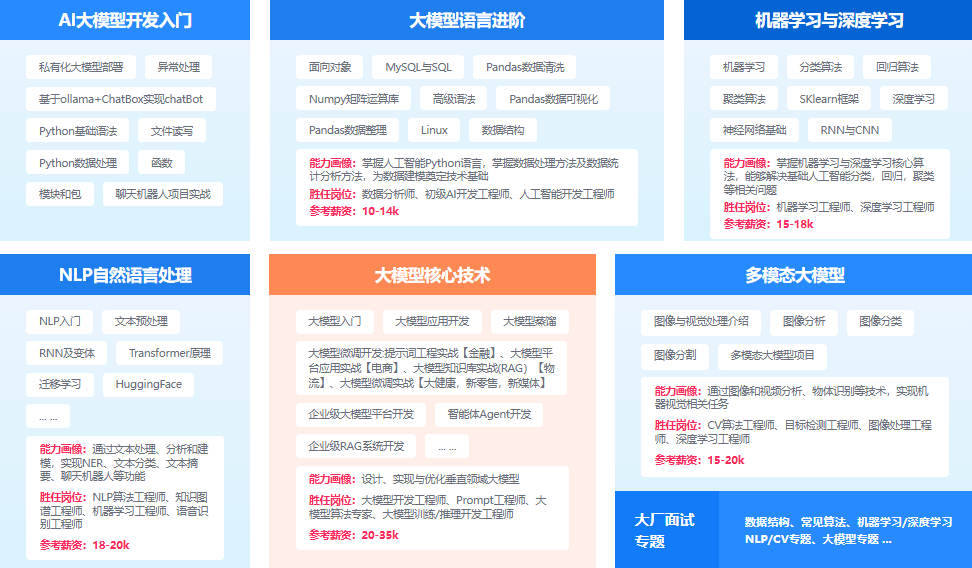 接下来,逐项展开。 一、学习路线要明确 进入大学后越早明确自己的技术方向越有利于学习,然后根据该方向的学习路线图(或学习大纲),将技术和项目各个击破。 如何选择技术方向?我给出如下参考: 1. 如果学历比较好,属于985/211层次的,或者是硕士及以上学历的,可以优先选择Python+大模型开发方向,未来从事算法工程师或AI大模型工程师等岗位。 Python+大模型开发的学习路线图参考如下: