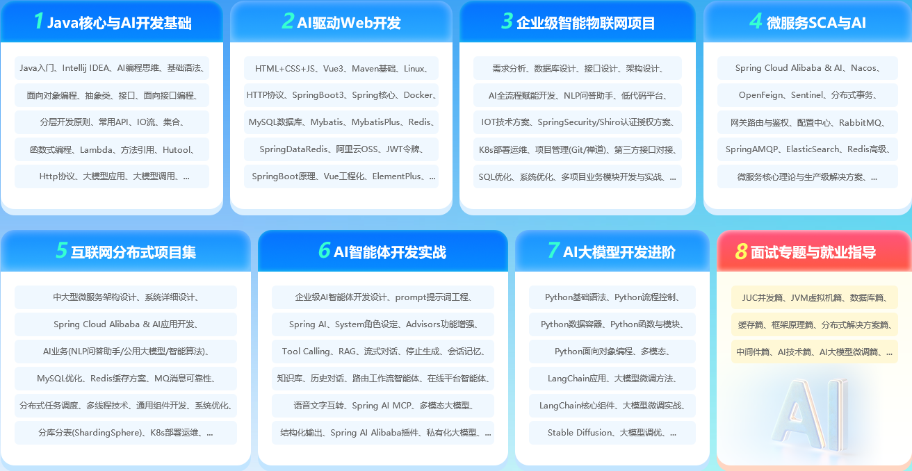 图15 Python+大模型学习路线图 2.如果学历是普通本科,可以优先选择Java+智能应用开发方向。公司里大部分核心业务都是由Java来开发的,此外随着大模型的快速普及,越来越多的企业都需要让传统应用集成AI能力,因此目前使用Java做智能应用(基于大模型的应用服务)开发的岗位也越来越多了。 Java+智能应用开发的学习路线图参考如下: