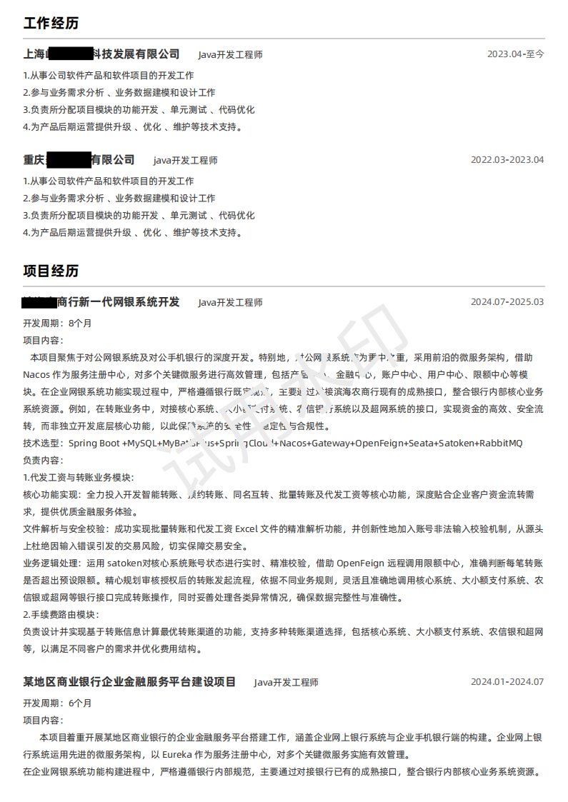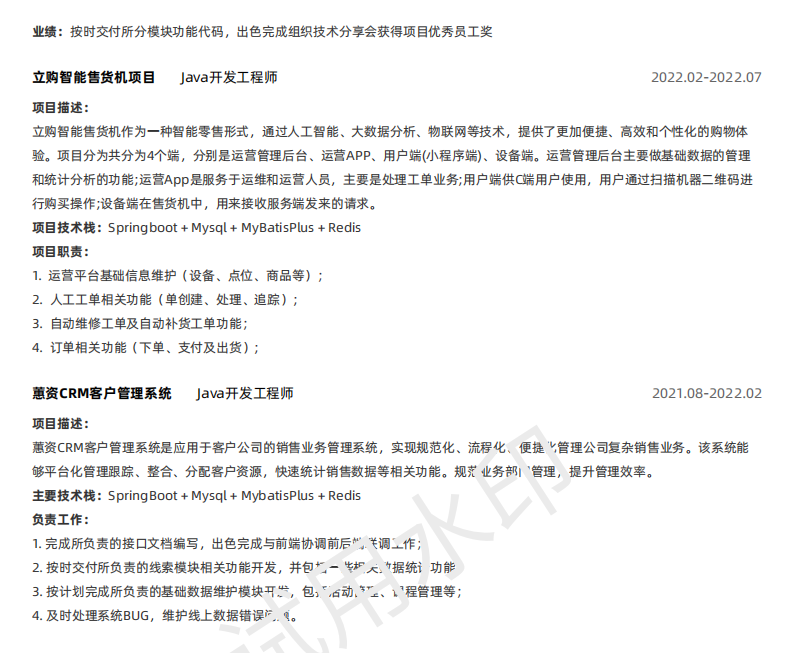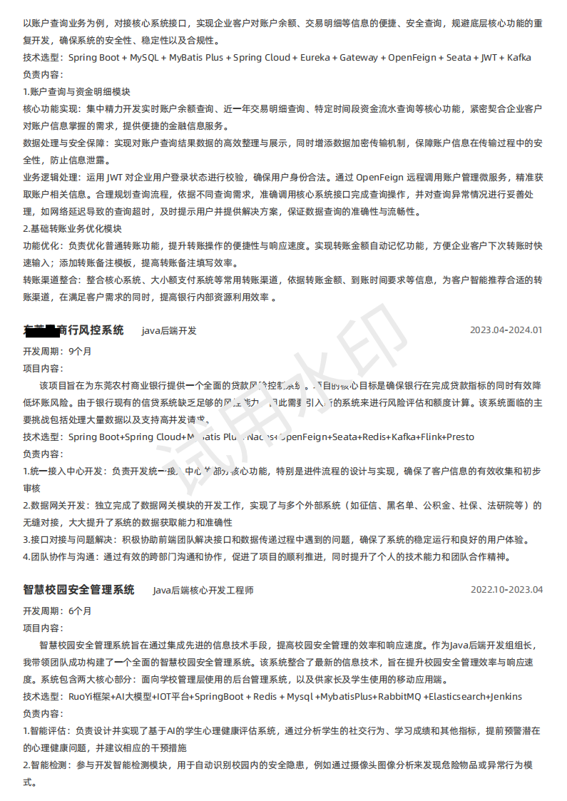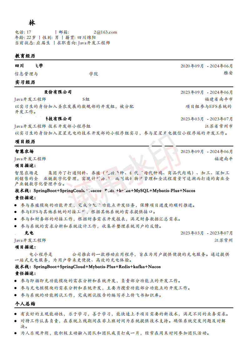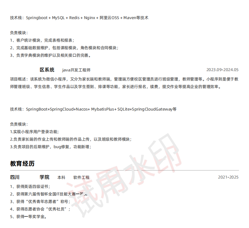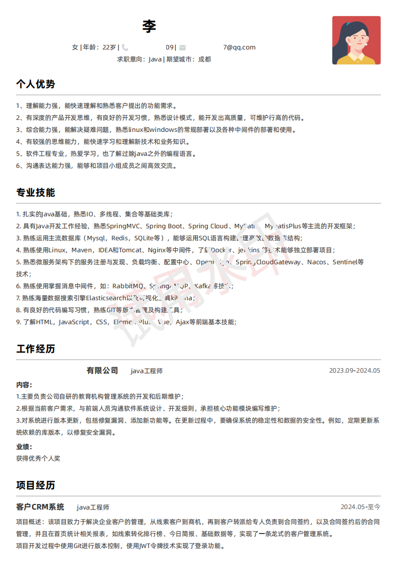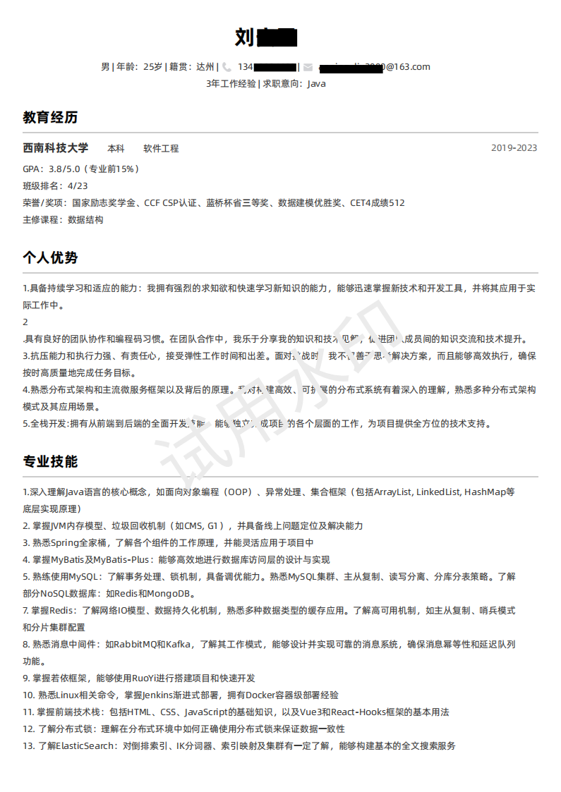 如果觉得一个人背八股文很枯燥,那么就找一个学习搭子,每天互相提问,互相模拟面试,这种学习方式非常高效。这种动作,要贯穿整个学习过程,直到面试成功为止。 四、书写简历有技巧 简历分为两种,一种用于校招,另一种用于社招。如果是应届生,这两种简历必须都要准备。 校招简历的要点(“两好一多一不写”): 1.我的成绩非常好 重点提现你是一个非常热爱自己的学校、专业的学生,同时也取得了非常好的各项成绩,包括各种比赛的成绩。 2.我的技术非常好 目标岗位所需的主流专业技能都要写上,不能因为是应届生就觉得对技术的要求就可以低一些,相反应届生的专业技能也要对标到中高级开发工程师的要求。 3.我的实习项目多 应届生至少需要写2个企业级项目,如果是Java方向,至少得写一个微服务架构的项目。 4.非关经历我不写 与目标岗位不相关的经历通通不写,比如创业经历、摆摊经历、发传单经历等。 如下是两个可参考的校招简历。